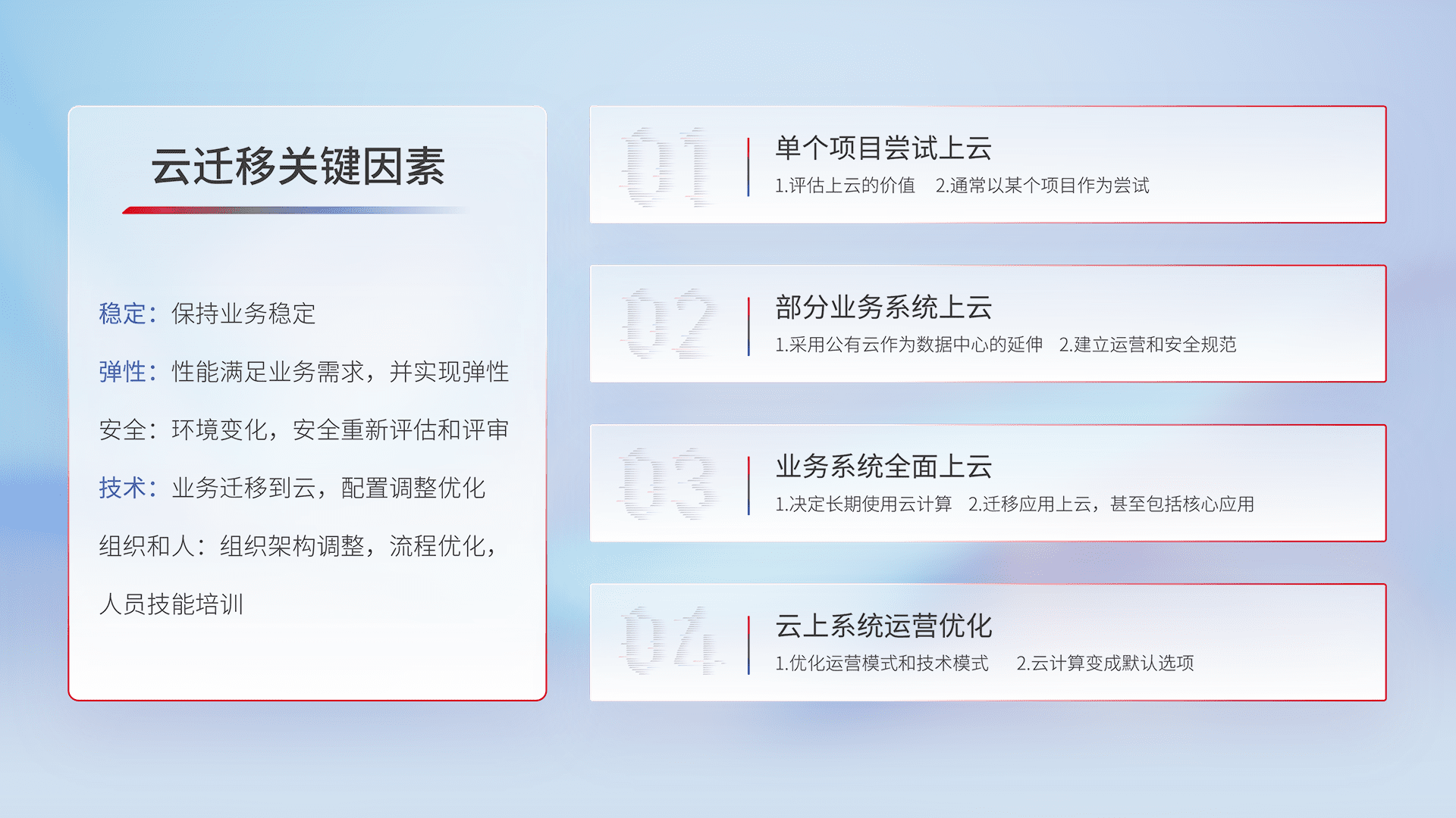结合实际业务,,从规划设计、、、云平台选型、、、、云原生改造、、数据迁移、、、集成交付,,迁移全过程为客户识别最佳上云路径,,,,做好风险识别管理,,设计网络架构、、、、身份权限、、安全审计合规、、操作审计、、、、日志审计、、、、监控告警策略、、、多站点容灾设计等,,,对云上基础设施进行整体规划,,,,提升IT治理水平,,,以满足弹性、、高可用、、、高性能的需求。。。。